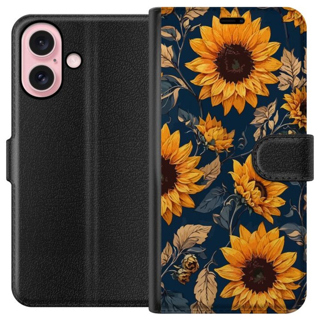 Apple iPhone 16 Svart Plånboksfodral Solrosor