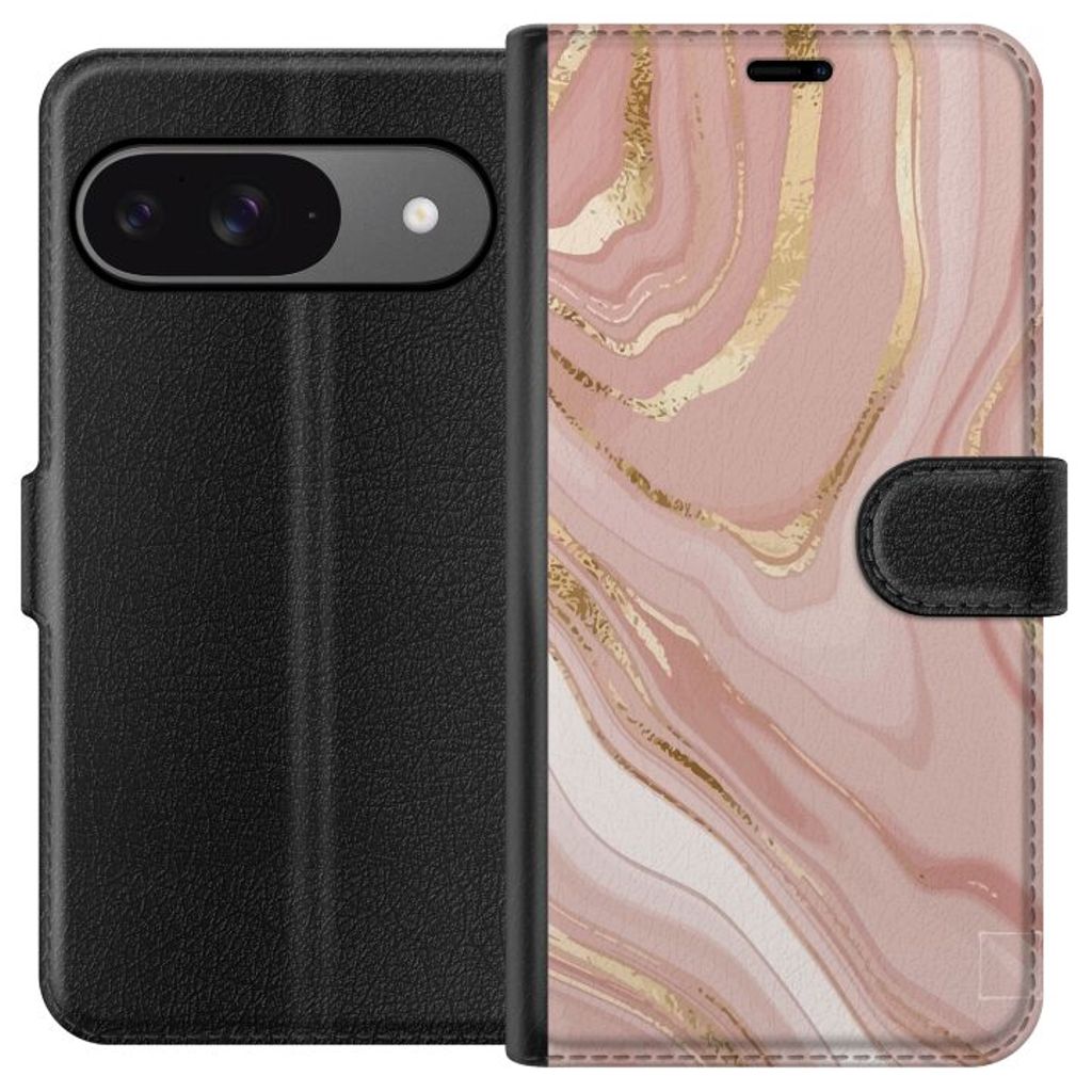 Google Pixel 9 Svart Plånboksfodral Ljusrosa marmor